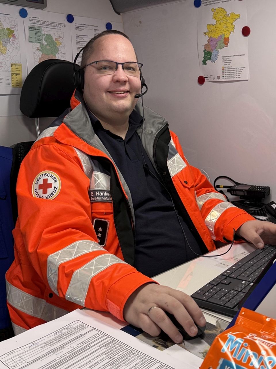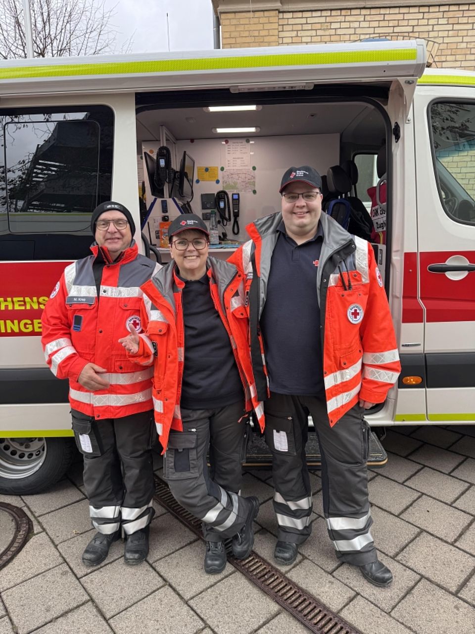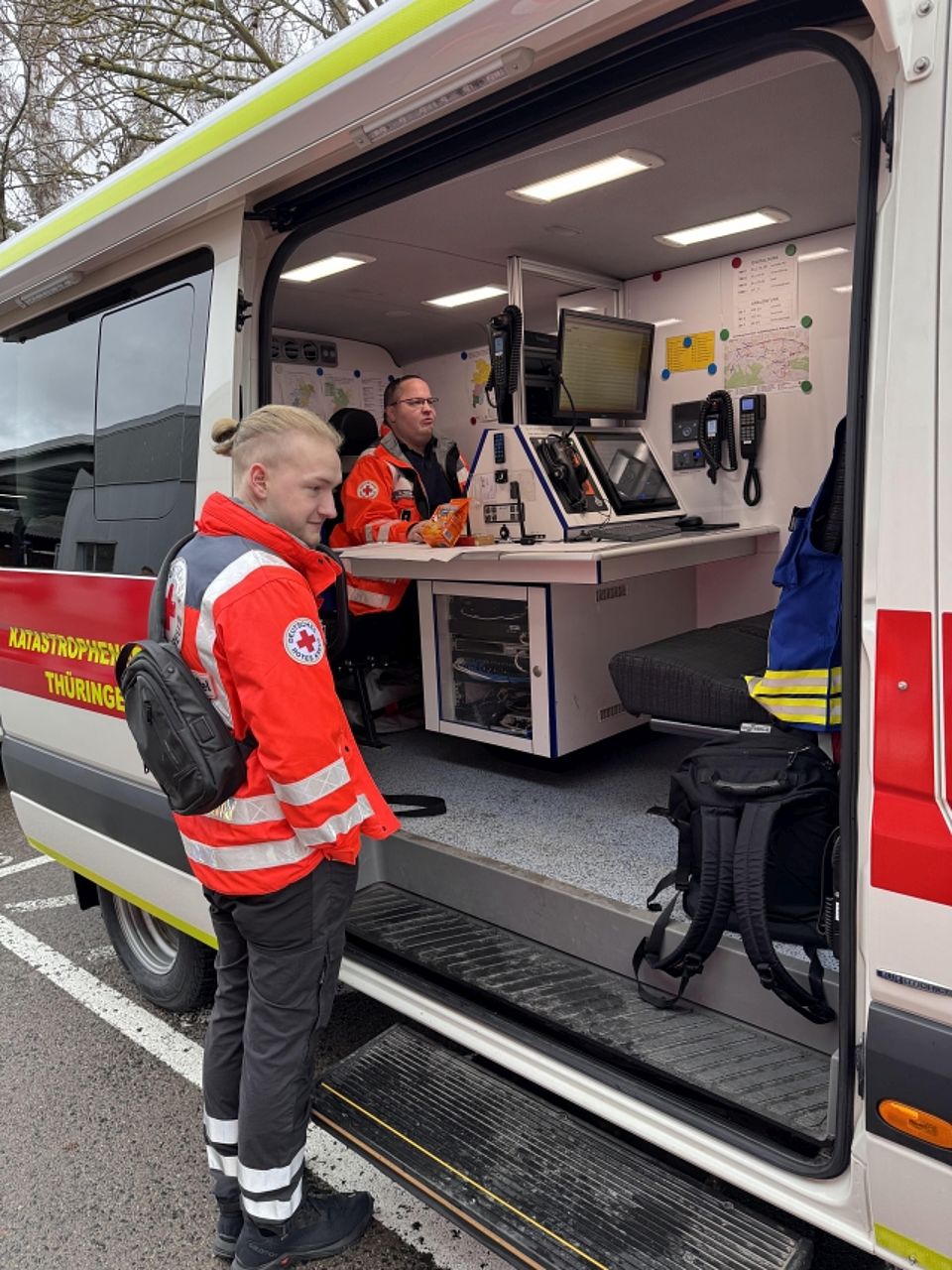 Nach der Lagebesprechung in der Rettungswache und der Mittagsversorgung durch das Betreuungsteam ging es für alle Einsatzkräfte an ihre Standorte. Die Einsatzleitung an der Hospitalstraße übernahm Martina Zwetzschke, unterstützt im ELW von Björn, Michael und Matthias.
