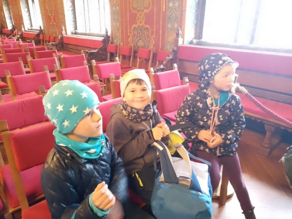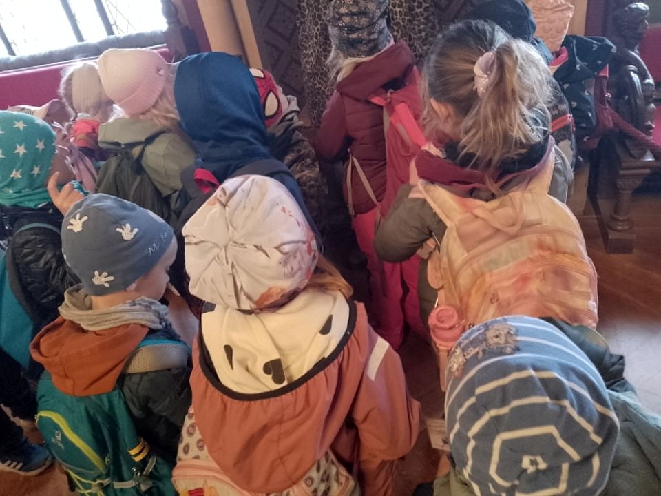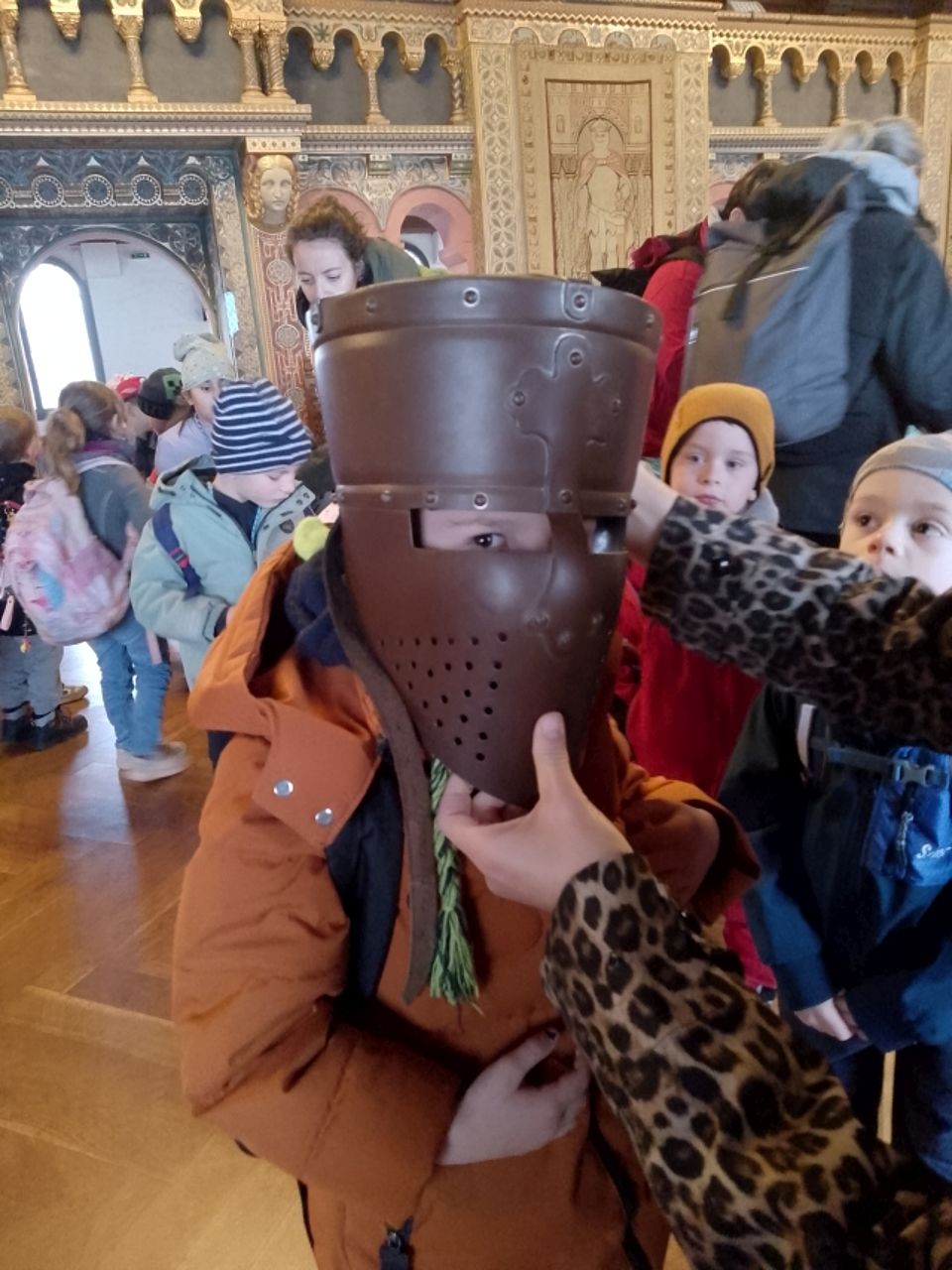 Nach einer kurzen Pause an der Eselstation ging es über die Zugbrücke weiter. Frau Ruhkamp, die Mama eines Kindes, entführte uns an spannende Orte der Burg. Wir erfuhren viel Neues und Spannendes über die Wartburg. Wir wissen jetzt, wann sie gebaut wurde und wie man früher baute. Auch haben wir erfahren, dass die Wartburg die größte Burg in Thüringen ist. Besonders aufregend war es im Prinzessinnenzimmer. Ein anderes Highlight war das Probieren eines echten Ritterhelmes.