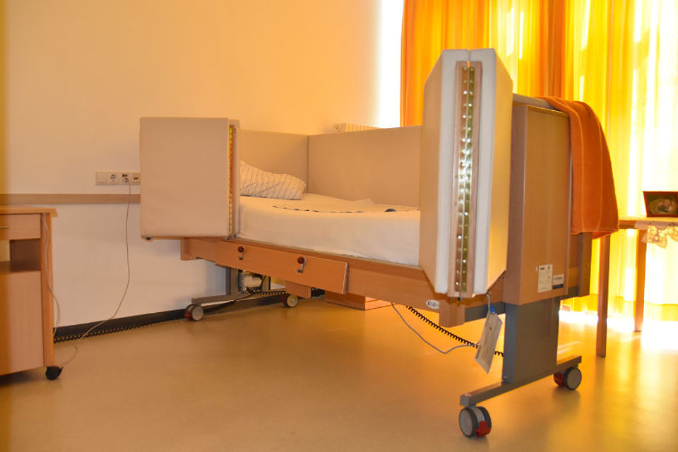 Die Heimbewohnerzimmer, Aufenthaltsräume, Therapieräume sowie Arbeitsräume sind in einem zweigliedrigen, sich öffnenden Gebäude mit lichtdurchfluteten Innenhöfen angeordnet